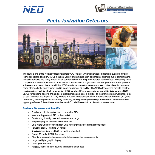 The NEO Series by mPower Electronics represents one of the most advanced families of handheld VOC (Volatile Organic Compound) detectors, offering ultra-sensitive ppb-level detection and high-range models up to 15,000 ppm. Designed for industrial professionals, first responders, and environmental teams, the NEO uses innovative photo-ionization detection (PID) technology paired with a high-performance UV lamp to ensure outstanding sensitivity, accuracy, and reliability.